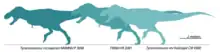Otros fósiles de tiranosáuridos encontrados en las mismas formaciones que Tyrannosaurus rex han sido originalmente atribuidos a diferentes taxones, como Aublysodon y Albertosaurus megagracilis,[59] que fue llamado posteriormente Dinotyrannus megagracilis en 1995.[60] Sin embargo, en la actualidad estos fósiles son universalmente considerados como ejemplares juveniles de Tyrannosaurus rex.[61]