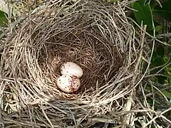 Anidan de abril a julio en árboles. El nido es de forma de cuenco, hecho de ramillas, bejucos y hierbas, y con recubrimiento interno fino de hierbas y raicillas. La puesta es de tres o cuatro huevos de color blanco parduzco o rosado con manchas de colores castaño, malva y gris.