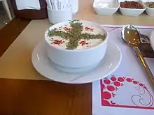 - Tzatziki, la versión griega de cacık,[3] es una salsa a base de pepino y yogur, consumida en muchos platos, especialmente de carne.