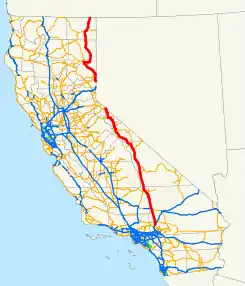 La U.S. Route 395 o Ruta Federal 395 (abreviada US 395) es una autopista federal ubicada en el estado de California. La autopista está dividida en dos segmento y el primer segmento inicia en el Sur desde la I 15 cerca de Hesperia y termina en el norte en la US 395 en Nevada, luego se divide y pasando por el estado de Nevada, se dirige hacia el Norte en la US 395 en Nevada, hasta culminar en el Norte, en la US 395 en Oregón.[2] La autopista tiene una longitud de 896,2 km (556.909 mi).[3] Antes de regresar a California, en Nevada, la ruta pasa por las ciudades de Carson City y Reno.