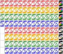 Este tipo de cartas se dividen en 4 colores: Azul, Rojo, Verde y Amarillo, y a su vez, cada color trae cartas numéricas del 0 al 9 (dos de cada una, salvo el cero).