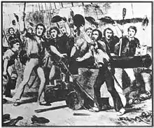 - Las fuentes difieren en el hecho de si este era un marinero británico o estadounidense; sin embargo, el vítore Hurra (Huzzah en el original en inglés) históricamente ha sido utilizado en forma de celebración