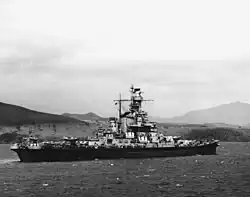 Entre julio y agosto de 1945, asignado a la Task Force 38.1, efectuó bombardeos contras las islas metropolitanas de Japón, y protegiendo a los portaaviones en sus ataques aéreos.[1] El 30 de agosto protegió el desembarco norteamericano en la Base Naval de Yokosuka, donde el 2 de septiembre tuvo lugar la ceremonia formal de la rendición japonesa. Posteriormente partió de vuelta a Estados Unidos adonde llegó el 29 de septiembre después de haber recorrido 234.888 millas, desde su botadora en Newport News y haber conseguido 9 estrellas de combate por sus servicios durante la guerra.[2]