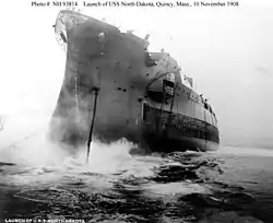 La quilla del North Dakota fue colocada en el astillero Fore River Shipyard, en Quincy, Massachusetts, el 16 de diciembre de 1907, y fue botado el 10 de noviembre de 1908. Después de finalizado el trabajo de acondicionamiento, la embarcación fue puesta en servicio con la flota del Atlántico el 11 de abril de 1910.[5][6][1] Participó en cruceros rutinarios de tiempos de paz, maniobras con la flota, y simulacros de artillería en el Atlántico y el Caribe. El 2 de noviembre de 1910, cruzó el Atlántico en un viaje de buena voluntad para visitar el Reino Unido y Francia.[5] Continuó con maniobras en el Caribe durante la siguiente primavera. Realizó dos cruceros de entrenamiento para guardamarinas de la Academia Naval, los veranos de 1912 y 1913. En enero de 1913, se unió a la escolta del crucero acorazado HMS Natal, que transportaba los restos de Whitelaw Reid, embajador estadounidense para la Gran Bretaña.[5][6][7]