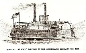 El CSS Queen of the West, un vapor de ruedas laterales construido en Cincinnati en 1862, fue comprado por el Departamento de Guerra en 1862 y equipado como ariete para operaciones en el Misisipi junto con la Flotilla Occidental.