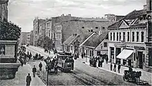 En el extremo norte de la calle, se trazó el «Mercado de la Ciudad Nueva» (actual «Plaza de la Libertad»), que estaba al sur del «Mercado de la Ciudad Vieja». Al principio (en torno a 1815), el nombre Ulica Piotrkowska se usaba para designar la parte norte de la calle, que unía los dos mercados, mientras que la parte sur (la actual Ulica Piotrkowska) no tenía ningún nombre.[2] Esto quiere decir que Ulica Piotrkowska era una especie de patio y mercado para la enorme Manufaktura, así como de toda la Ciudad Nueva. El hecho de que Lodz tuviera esta historia es la razón por la cual no desarrolló un centro clásico con una plaza del mercado y organizaciones públicas e instituciones comerciales alrededor, y Ulica Piotrkowska desempeñó este papel.[2]