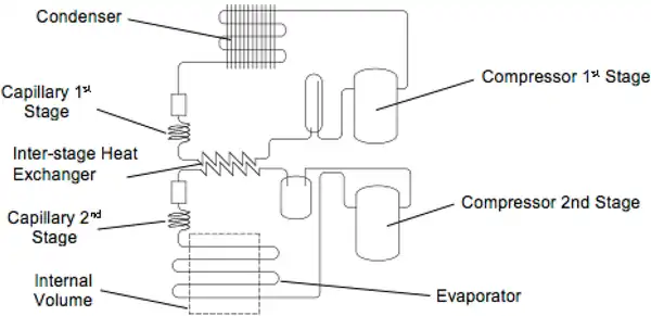 Los ultracongeladores que emplean el sistema de refrigeración en cascada utilizan hasta 20 veces la huella energética de los frigoríficos domésticos y se utilizan para refrigerar con fluidos de gases de efecto invernadero (normalmente hidrofluorocarbono R-508B ).[5] Los ultracongeladores modernos emplean mezclas de gases HC (es decir, hidrocarburos ): típicamente, etano y propano.