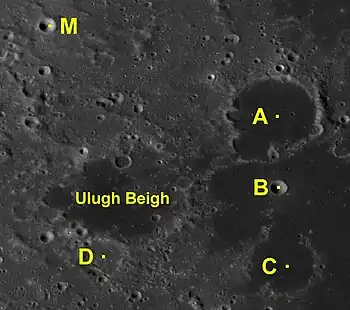 Por convención estos elementos son identificados en los mapas lunares poniendo la letra en el lado del punto medio del cráter que está más cerca de Ulugh Beigh.