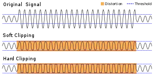 Distorsión y sobresaturación: las unidades de distorsión y saturación remodelan o "clipean" la forma de onda de una señal de audio haciendo que sus picos se recorten, creando sonidos "cálidos" agregando armónicos o sonidos "ásperos" agregando sobretonos enarmónicos. En los amplificadores de bulbos, la distorsión es creada comprimiendo la señal de salida de un instrumento en válvulas de vacío.[52][53] Los pedales de distorsión producen picos perfectamente recortados o "clipeados". Los pedales de sobresaturación producen una distorsión "suave" como la distorsión de las válvulas comprimiendo la onda sinusoidal sin recortarla. Como los amplificadores de bulbos, las unidades de sobresaturación predicen sonidos "limpios" a bajo volumen y sonidos distorsionados "cálidos" a volúmenes altos. Los pedales de distorsión y saturación pueden ser de transistores o digitales.[54][55]