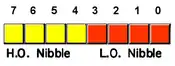 Un byte consta también de 2 nibbles; los bits 0, 1, 2 y 3 forman el llamado nibble de menor orden, y los bits 4, 5, 6 y 7 forman el nibble de mayor orden. Como un byte está formado por exactamente dos nibbles, es posible representar cualquier valor con dos dígitos hexadecimales.