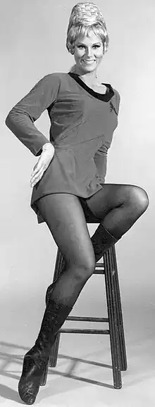 Si bien los dos episodios piloto muestran a mujeres con pantalones, la mayoría del personal femenino de la Flota Estelar usa trajes más reveladores después de solicitarlo así la cadena NBC; Grace Lee Whitney, que interpretaba a la contramaestre Janice Rand, sugirió que podían llevar minifaldas . William Shatner observó que Star Trek, "para el agrado de todos los hombres en el plató, de hecho en todo el mundo, luciría las faldas femeninas más cortas de cualquiera de las series habituales".[3] Las mujeres usaban vestidos de minifalda (de los mismos materiales y colores que las camisas) con slips negros y medias oscuras. Ambos sexos usaban botas negras. Nichelle Nichols no creía que las minifaldas fueran inusualmente cortas o reveladoras: