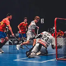 ![]() Partido del Campeonato Mundial de 2024 entre equipo español El Valle (en defensa) contra el finlandés LASB (en ataque) | ||