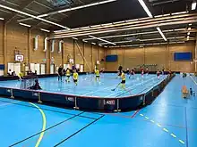 - La valla lateral tiene sólo 50 cm de altura (en comparación con ~1,2 m en el hockey sobre hielo). No está fijada al suelo.