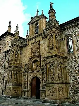 Fue levantada por Pierre Picart en torno a 1546. Se construyó primero la portada central con la entrada principal, que tiene gran similitud con la del Convento de las Dueñas de Salamanca. A ambos lados se añadieron sendos pilastrones esculpidos con figuras de bulto, relieves y columnillas, y prolongados con torrecillas, a inspiración del Colegio de Santa Cruz de Valladolid. Otros dos pilastrones de similar traza se sitúan en los esquinales de cada torre lateral, que son un piso más altas que el cuerpo principal. Las cuatro torrecillas así como los restantes seis vértices de las aguas de los tejados de los cubos laterales son rematadas por figuras de guerreros.