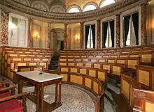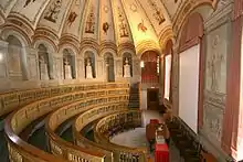 La escalera de la universidad, 1823. - Aula Volta: en el primer piso en el patio de las estatuas. En esta clase, Alessandro Volta realizó su enseñanza y los primeros experimentos sobre electricidad. Fue encargado por José II, quien encomendó el proyecto a Leopoldo Pollack en 1787. Tiene forma de anfiteatro y presenta trampantojos que prolongan la serie de ventanales en los escalones frente a la silla. El espacio está marcado por medias columnas jónicas que se redondean en la curvatura de los escalones[12].