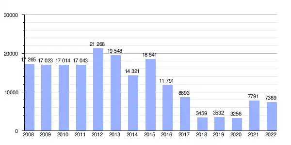 | Gráfica de evolución demográfica de Utrera[27] entre 1842 y 2021 |