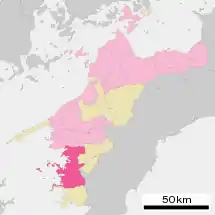 • 1934: el 1° de septiembre absorbe a la Villa de Kushima (九島村 Kushima-mura?) del Distrito de Kitauwa.