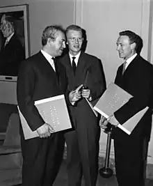 ![]() Uwe Johnson (al medio) es rodeado por el cineasta Rudolf Noelte y por el actor Erich Schellow, durante la entrega del Premio Fontane, el 18 de marzo de 1960. | ||