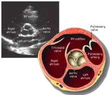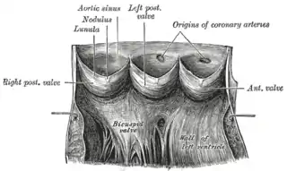 La válvula aórtica normalmente tiene tres valvas o cúspides de forma semilunar.[Nota 1] Suelen llamarse cúspide coronaria izquierda, cúspide coronaria derecha y cúspide no coronaria.[Nota 2] Cada valva está separada de la vecina por una comisura.[2][3][4][5]