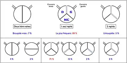 - Tipo 1: Válvula tricúspide con un rafe. Existen tres valvas anatómicas pero dos valvas funcionales por la fusión de dos de ellas. Es el tipo más común con un 88 por ciento de prevalencia. La mayoría (71 por ciento) tiene el rafe entre las coronarianas derecha e izquierda.