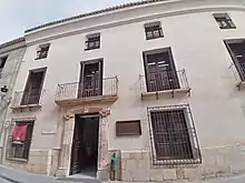 Ejemplo de vivienda señorial - Viviendas señoriales: Construidas entre los siglos XVII y XVIII se caracterizan por ser de aspecto robusto y macizo, compuestas de tres plantas, donde abunda el ladrillo (en esquinas, portadas y balcones); aleros de teja; piedra d ecantería para zócalos, portadas y balcones; portadas enmarcadas en piedra o ladrillo; forjas en balcones; y en algunos casos escudos nobiliarios en las fachadas. En algunas ocasiones, presentan bóvedas de arista en los sótanos.[15]