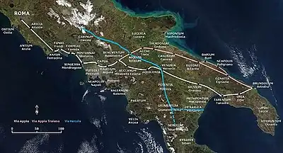 Existen muchas incertidumbres sobre los tramos norte y sur de la arteria, mientras que es mejor conocido el tramo intermedio que conducía desde el Samnio hirpino, y precisamente, desde el vicus de Aequum Tuticum, hasta Grumentum, en Lucania.