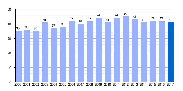| Gráfica de evolución demográfica de Vírgala Mayor[4] entre 2000 y 2017 |