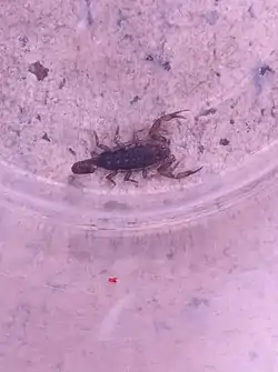 Es un escorpión perteneciente a la familia Vaejovidae, del orden Scorpiones. Todo el cuerpo tiene una textura granulosa. El color es café negro abigarrado y marrón rojizo, el vientre es color marrón y los pedipalpos son de color marrón rojizo. Llega a medir de 3 a 4 cm de longitud. La cola o telson es engrosada y con quillas en los bordes. El aguijón es alargado, no presenta una curvatura muy marcada.[1] No se tiene registro alguno de que sea una especie de importancia médica para el hombre.