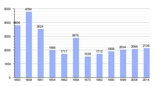 | Gráfica de evolución demográfica de Val-Cenis entre 1800 y 2014 |