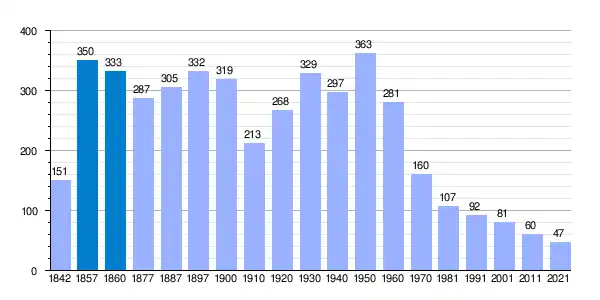 | Gráfica de evolución demográfica de Valbuena de Pisuerga[1] entre 1842 y 2021 |