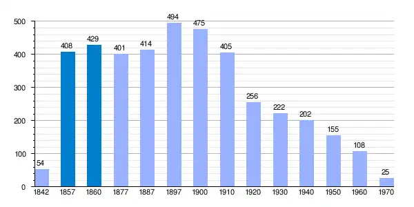 | Gráfica de evolución demográfica de Valdelateja[8] entre 1842 y 1970 |