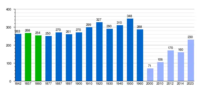 Población de derecho (1842-1970, excepto años 1857 y 1860 que es población de hecho) según los censos de población del INE.[15] Población de hecho (1857 y 1860) según los censos de población del INE.[15] Población residente empadronada (2000-2017) según el Padrón Continuo por Unidad Poblacional de 2017 del INE.[3] |