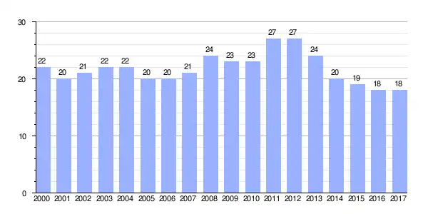 | Gráfica de evolución demográfica de Valdeprado[2] entre 2000 y 2017 |