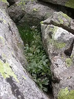 Se encuentra en roquedos, gleras y fisuras, preferentemente calcáreos, en cumbres ± sombrías; a una altitud de 1300-3220 metros, en la Cordillera Cantábrica, Pirineos, Sistema Ibérico, Sierra Nevada y Norte de África (Marruecos, Atlas).[1]