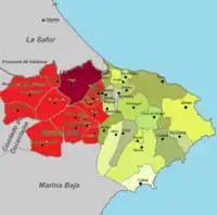 Los pueblos que forman la subcomarca son Pego, Adsubia, Vall de Gallinera, Valle de Alcalá, Vall de Ebo, Castell de Castells, Benichembla, Murla, Orba, Ráfol de Almunia, Sagra, Tormos y Vall de Laguart,[3] aunque a nivel de mancomunidad, no todos los pueblos forman parte del mismo.