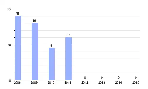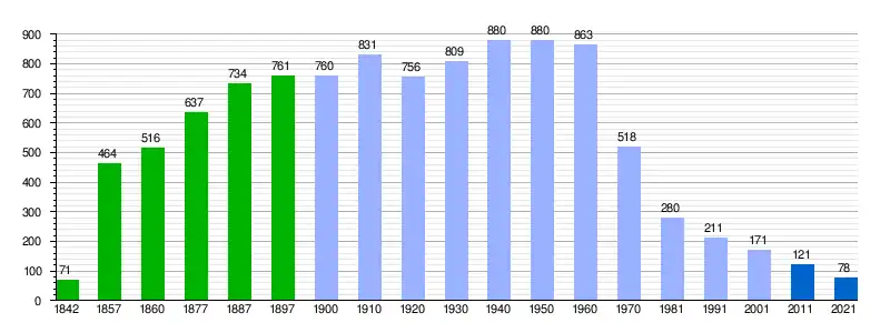 Población de derecho (1842-1897, excepto 1857 y 1860 que es población de hecho) según los censos de población del siglo XIX.[23] Población de derecho (1900-1991) o población residente (2001) según los censos de población del INE.[23] Población según el padrón municipal de 2011[24] y de 2021 del INE. Nota: Entre el censo de 1857 y el anterior, este municipio desaparece porque se integra en el municipio de Olmo de La Guareña, volviendo a aparecer entre el censo de 1877 y 1887, al redenominarse la unión de ambas poblaciones como Vallesa. |