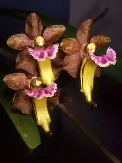 Es una planta de tamaño pequeño o mediano que prefiere clima cálido a fresco, es epífita, con un tallo corto que lleva muchas hojas curvas, con ápice bi-lobulado. Florece con una inflorescencia de 10 a 25 cm de largo, colgante, laxa con 3 a 15 fragantes flores de 2 cm de ancho que se producen en los fines de invierno y comienzos de primavera.[1]