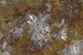 | Hábito cristalino | cristales laminares o alargados, típicamente en planas rosetas, menos común globular | |