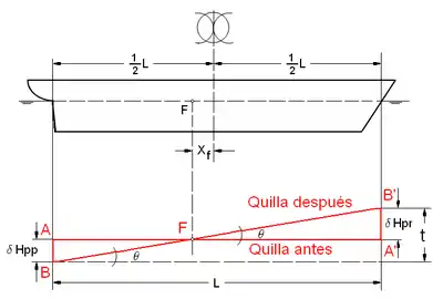 Si asumimos para el análisis que el buque tenía su quilla en forma horizontal ( sin asiento) previa a la traslación entonces la quilla adoptará una nueva orientación rotando la embarcación un ángulo sobre un eje transversal que pasa por el centro de flotación F.