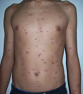 Otras lesiones parecidas pueden ser causadas por ricketsiosis,[12] dermatitis herpetiforme, impétigo, picaduras de insectos, sarna, urticaria papular, erupciones causadas por fármacos y eritema multiforme.[13]