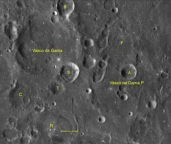 Por convención estos elementos son identificados en los mapas lunares poniendo la letra en el lado del punto medio del cráter que está más cercano a Vasco da Gama.