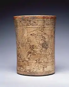El vaso Princeton es un ejemplo destacado de cerámica maya del Clásico Tardío en estilo códice. Fue saqueado ilegalmente y ahora se encuentra en el Museo de Arte de la Universidad de Princeton. Originalmente servía como recipiente para beber chocolate, y representa una sala del trono ocupada por un dios anciano, que lleva un tocado de búho, y cinco mujeres jóvenes que lo rodean. Frente al trono, un cautivo maniatado es decapitado por dos enmascarados. Durante mucho tiempo se creyó que esta escena se refería a un episodio del Popol Vuh.