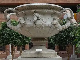 El diseño y gran parte del adorno ricamente decorado, es romano, de principios del siglo II, se estima que fue construido entre los años 118 y 133, mide 170 cm de alto e incluye el mango de 211 cm de ancho. En su tamaño original, por lo tanto, no es un contenedor de flores, sino más bien un elemento decorativo de la arquitectura de jardín. Las dos asas consisten en dos hebras de vides entrelazadas, que continúan por debajo del borde con hojas y frutos. La parte inferior del cuerpo está cubierta con hojas de acanto. En el escudo aparece la cabeza de un felino la pared está decorada con cabezas de sátiros y la cabeza de Dionisos. La parte posterior está diseñada de la misma manera, pero en lugar de Dionisos está aquí una copia de su esposa Ariadne. La cabeza de esta mujer es un suplemento aparentemente realizado en el siglo XVIII por un escultor italiano. La vasija monumental es en forma y decoración una imitación de la antigüedad de los recipientes habituales. Las imitaciones de tales vasijas existieron desde el último período helenístico y preferentemente eran colocadas en jardines y pórticos.
