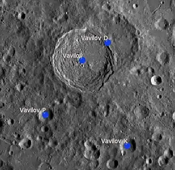 Por convención estos elementos son identificados en los mapas lunares poniendo la letra en el lado del punto medio del cráter que está más cercano a Vavilov.