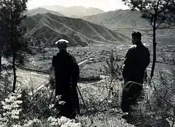 ![]() El entonces presidente Chiang Kai-shek y su hijo Chiang Ching-kuo miran un valle de Fenghua el 25 de enero de 1949, en diciembre de ese año sus fuerzas son expulsadas a la isla de Taiwán al perder la guerra civil china. Chiang Ching-kuo llegaría a ser presidente de la República de China en Taiwán, siendo el último nacido en la China continental que llegó a ese puesto. | ||