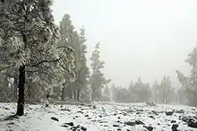 Los pinares empiezan a aparecer a partir de los mil metros conforme nos acercamos a la cumbre, en la que el Pico de las Nieves, atalaya privilegiada del mar de nubes que se forma en medianías, y altura máxima del municipio.