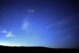 Vela es una constelación austral, una de las cuatro partes en que fue dividida la constelación de Argo Navis (el navío Argos), siendo las otras Carina (la quilla), Puppis (la popa) y Pyxis (la brújula).
