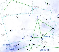 - ο Velorum, la estrella más brillante del cúmulo IC 2391, también llamado Cúmulo de Ómicron Velorum.