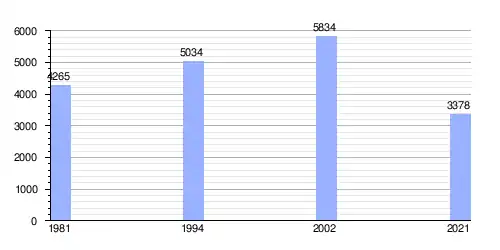 | Gráfica de evolución demográfica de Velešta entre 1981 y 2021 |