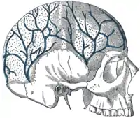 ![]() Representación esquemática de una sección de la parte superior del cráneo. Vena diploica, en el interior del cráneo, etiquetada arriba a la izquierda. | ||